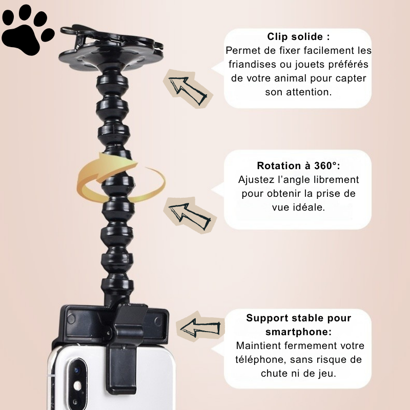 Fixez simplement une friandise ou un petit jouet sur le clip, et votre compagnon regardera naturellement vers l’objectif.