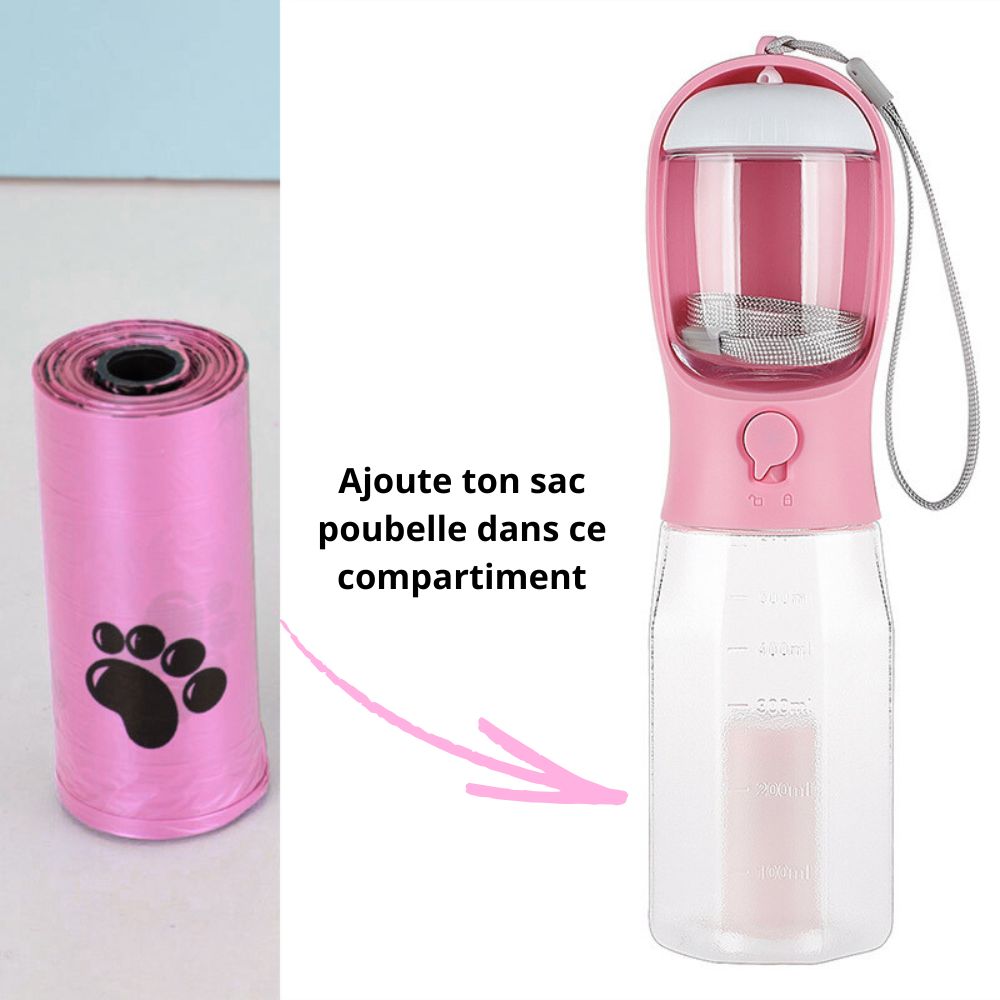 « Super pratique, bien étanche, réservoir d’eau juste bien pour les balades et le gros plus : les compartiments pour les friandises/croquettes et les sacs intégrés dedans qui ne prennent pas de place ! Je recommande 👌 En plus le prix est vraiment abordable ! »